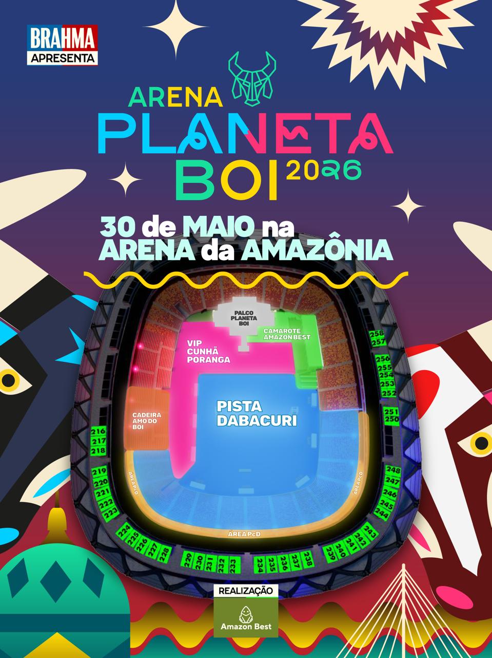 O Arena Planeta Boi traz para a Arena da Amazônia toda a força, a emoção e a grandiosidade do Festival de Parintins. Em uma noite de celebração da cultura amazônica, o público vive uma experiência intensa com performances cênicas, efeitos especiais e com as apresentações dos bois Caprichoso e Garantido e seus itens oficiais.