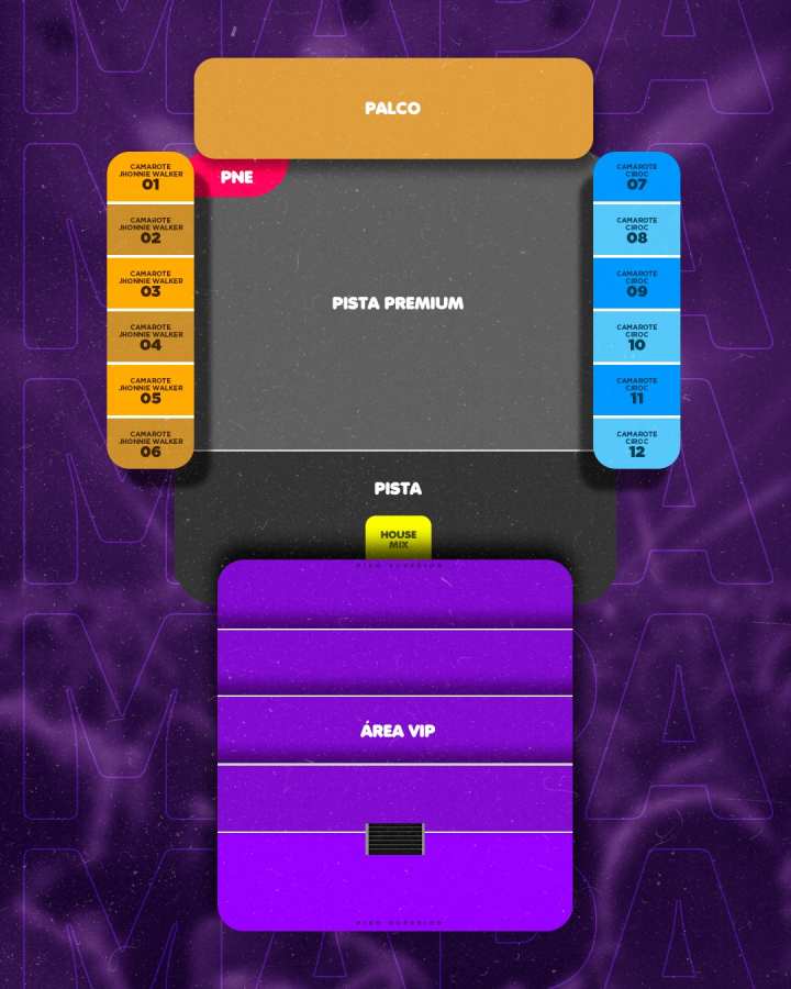 Área vip: setor no segundo piso, visão privilegiada do palco, com desnível.